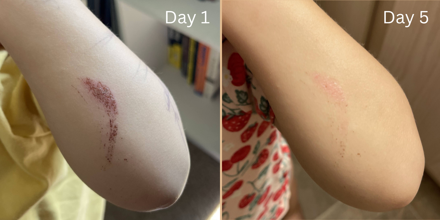 This my daughter’s elbow after a scrape — just five days apart using our tallow-based balm. No harsh chemicals, just pure, nourishing ingredients that help skin recover the way nature intended.